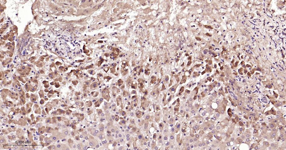 Paraformaldehyde-fixed, paraffin embedded Human Liver; Antigen retrieval by boiling in sodium citrate buffer (pH6.0) for 15 min; The section was incubated with CFH Polyclonal Antibody, Unconjugated (bs-9525R) at 1:200 overnight at 4°C, followed by conjugation to the bs-0295G-HRP and DAB (C-0010) staining.