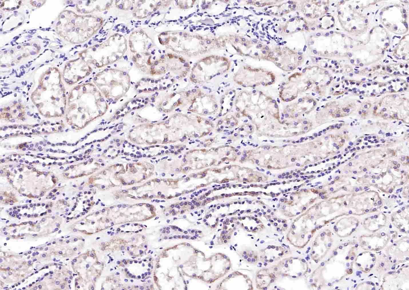 Paraformaldehyde-fixed, paraffin embedded (Human kidney); Antigen retrieval by boiling in sodium citrate buffer (pH6.0) for 15min; Block endogenous peroxidase by 3% hydrogen peroxide for 20 minutes; Blocking buffer (normal goat serum) at 37°C for 30min; Antibody incubation with (CFH) Polyclonal Antibody, Unconjugated (bs-9525R) at 1:200 overnight at 4°C, followed by operating according to SP Kit(Rabbit) (sp-0023) instructionsand DAB staining.