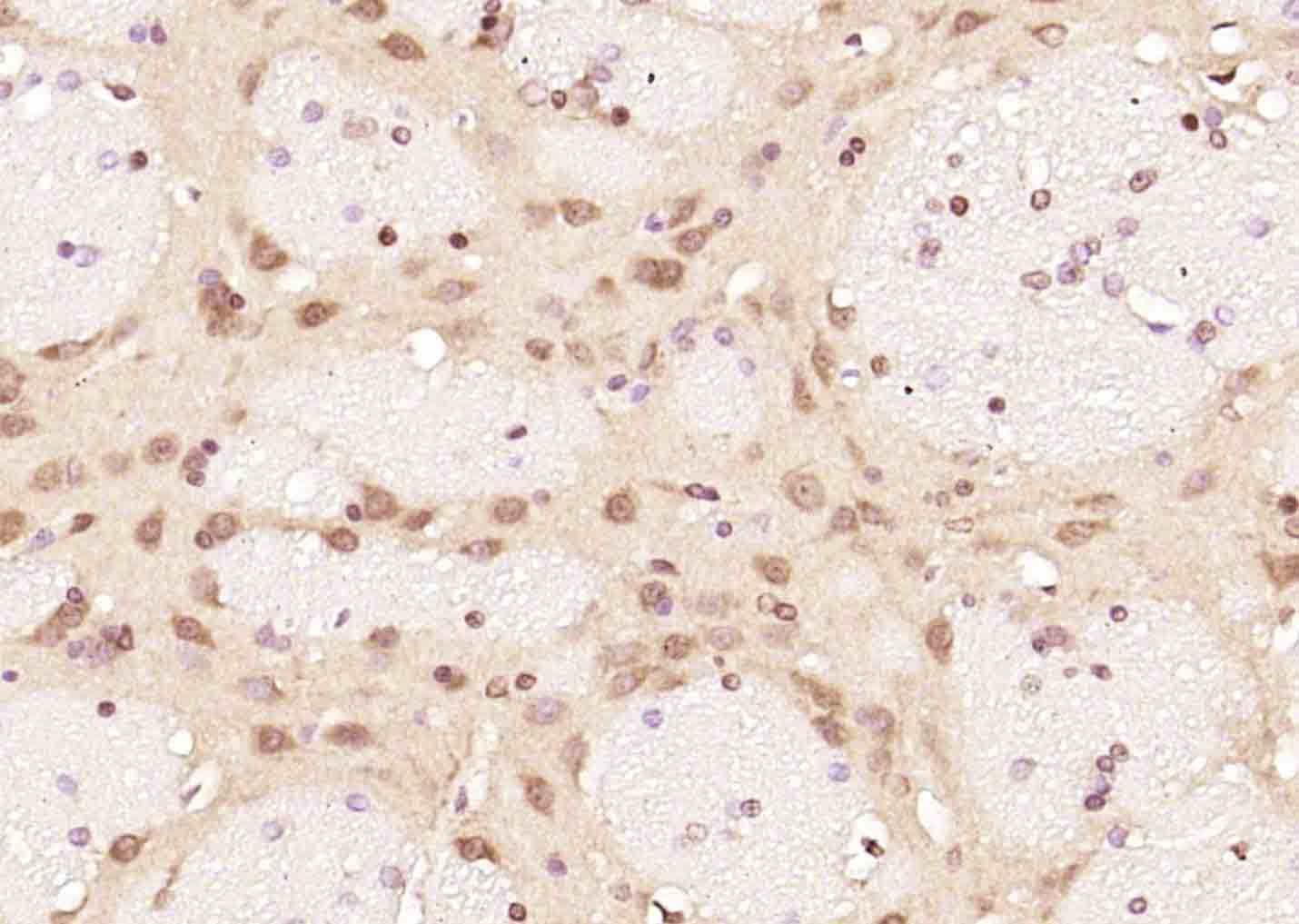 Paraformaldehyde-fixed, paraffin embedded (rat brain); Antigen retrieval by boiling in sodium citrate buffer (pH6.0) for 15min; Block endogenous peroxidase by 3% hydrogen peroxide for 20 minutes; Blocking buffer (normal goat serum) at 37°C for 30min; Antibody incubation with (hnRNP C1) Polyclonal Antibody, Unconjugated (bs-6459R) at 1:200 overnight at 4°C, followed by operating according to SP Kit(Rabbit) (sp-0023) instructionsand DAB staining.