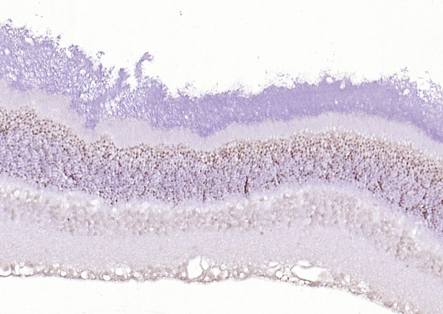 Paraformaldehyde-fixed, paraffin embedded (mouse eye); Antigen retrieval by boiling in sodium citrate buffer (pH6.0) for 15min; Block endogenous peroxidase by 3% hydrogen peroxide for 20 minutes; Blocking buffer (normal goat serum) at 37°C for 30min; Antibody incubation with (RNF165) Polyclonal Antibody, Unconjugated (bs-9258R) at 1:200 overnight at 4°C, followed by operating according to SP Kit(Rabbit) (sp-0023) instructionsand DAB staining.