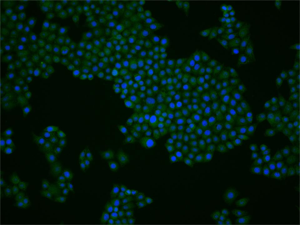 MCF7 cell; 4% Paraformaldehyde-fixed; Triton X-100 at room temperature for 20 min; Blocking buffer (normal goat serum, C-0005) at 37°C for 20 min; Antibody incubation with (TET2) polyclonal Antibody, Unconjugated (bs-9449R) 1:25, 90 minutes at 37°C; followed by a conjugated Goat Anti-Rabbit IgG antibody at 37°C for 90 minutes, DAPI (blue, C02-04002) was used to stain the cell nuclei.