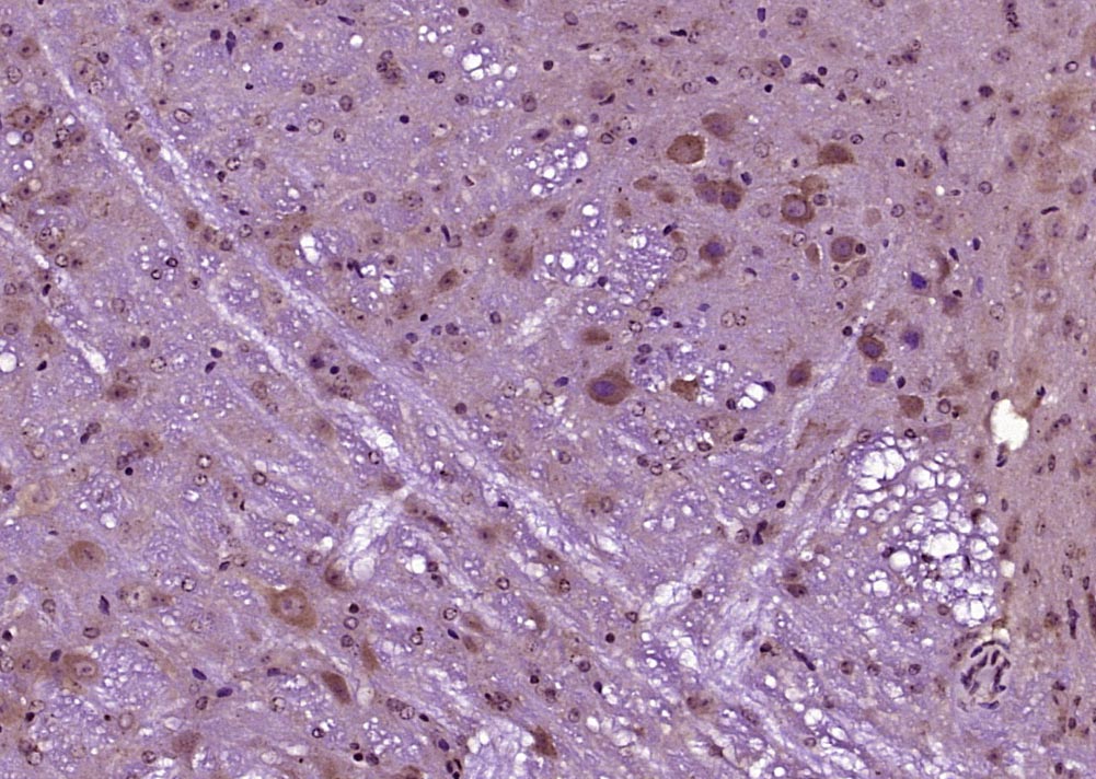 Paraformaldehyde-fixed, paraffin embedded (Mouse brain); Antigen retrieval by boiling in sodium citrate buffer (pH6.0) for 15min; Block endogenous peroxidase by 3% hydrogen peroxide for 20 minutes; Blocking buffer (normal goat serum) at 37°C for 30min; Antibody incubation with (GDN) Polyclonal Antibody, Unconjugated (bs-9845R) at 1:400 overnight at 4°C, followed by operating according to SP Kit(Rabbit) (sp-0023) instructionsand DAB staining.