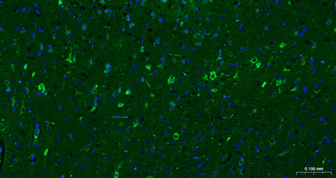 Paraformaldehyde-fixed, paraffin embedded Mouse Cerebrum; Antigen retrieval by boiling in sodium citrate buffer (pH6.0) for 15 min; The section was incubated with Osteocalcin Polyclonal Antibody, Unconjugated (bs-4917R) at 1:200 overnight at 4°C. Followed by conjugated Goat Anti-Rabbit IgG antibody (green, bs-0295G-BF488), DAPI (blue, C02-04002) was used to stain the cell nuclei.