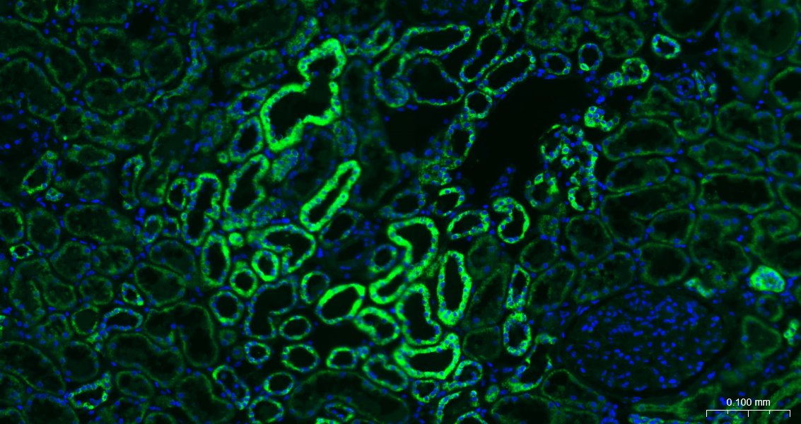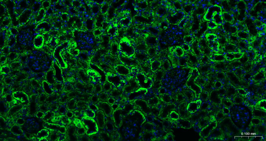 Paraformaldehyde-fixed, paraffin embedded Mouse Kidney; Antigen retrieval by boiling in sodium citrate buffer (pH6.0) for 15 min; The section was incubated with Osteocalcin Polyclonal Antibody, Unconjugated (bs-4917R) at 1:200 overnight at 4°C. Followed by conjugated Goat Anti-Rabbit IgG antibody (green, bs-0295G-BF488), DAPI (blue, C02-04002) was used to stain the cell nuclei.