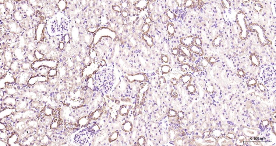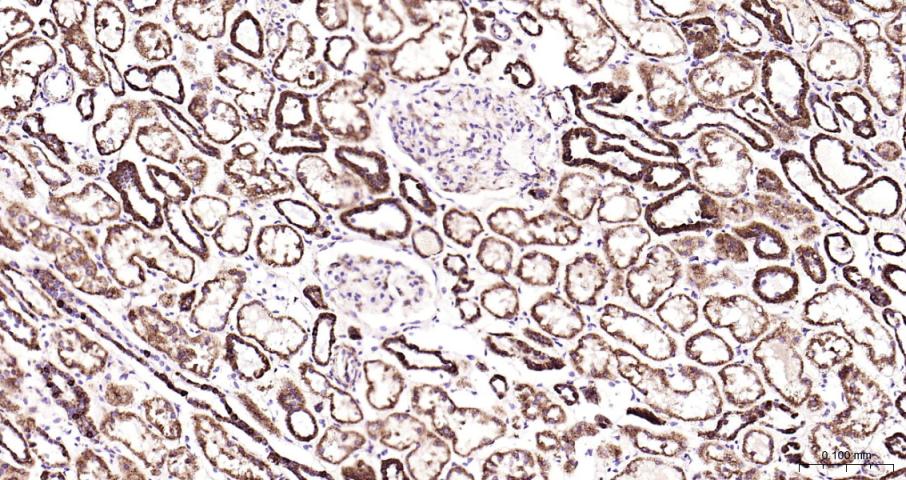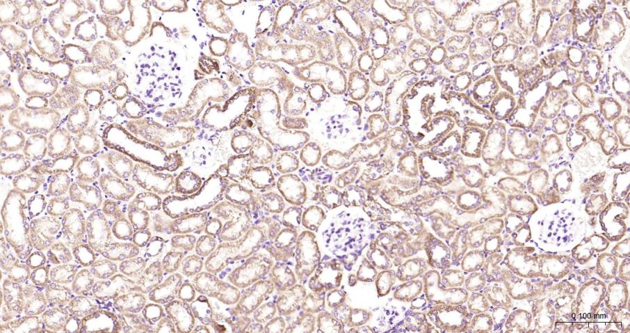 Paraformaldehyde-fixed, paraffin embedded Mouse Kidney; Antigen retrieval by boiling in sodium citrate buffer (pH6.0) for 15 min; The section was incubated with Osteocalcin Polyclonal Antibody, Unconjugated (bs-4917R) at 1:200 overnight at 4°C, followed by conjugation to the bs-0295G-HRP and DAB (C-0010) staining.