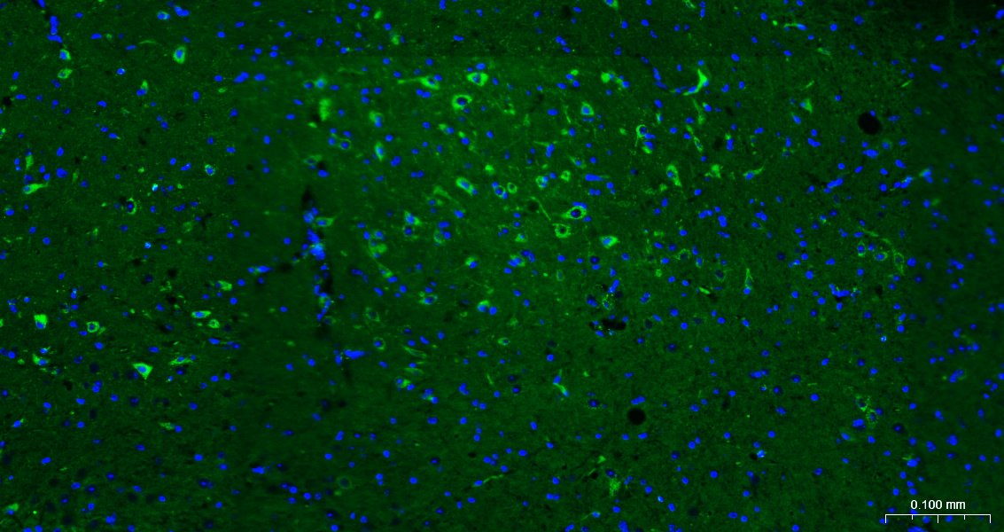 Paraformaldehyde-fixed, paraffin embedded Rat Cerebrum; Antigen retrieval by boiling in sodium citrate buffer (pH6.0) for 15 min; The section was incubated with Osteocalcin Polyclonal Antibody, Unconjugated (bs-4917R) at 1:200 overnight at 4°C. Followed by conjugated Goat Anti-Rabbit IgG antibody (green, bs-0295G-BF488), DAPI (blue, C02-04002) was used to stain the cell nuclei.