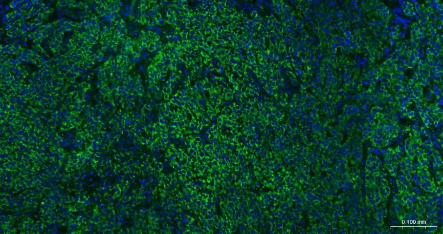 Paraformaldehyde-fixed, paraffin embedded Human Kidney; Antigen retrieval by boiling in sodium citrate buffer (pH6.0) for 15 min; The section was incubated with Osteocalcin Polyclonal Antibody, Unconjugated (bs-4917R) at 1:200 overnight at 4°C. Followed by conjugated Goat Anti-Rabbit IgG antibody (green, bs-0295G-BF488), DAPI (blue, C02-04002) was used to stain the cell nuclei.