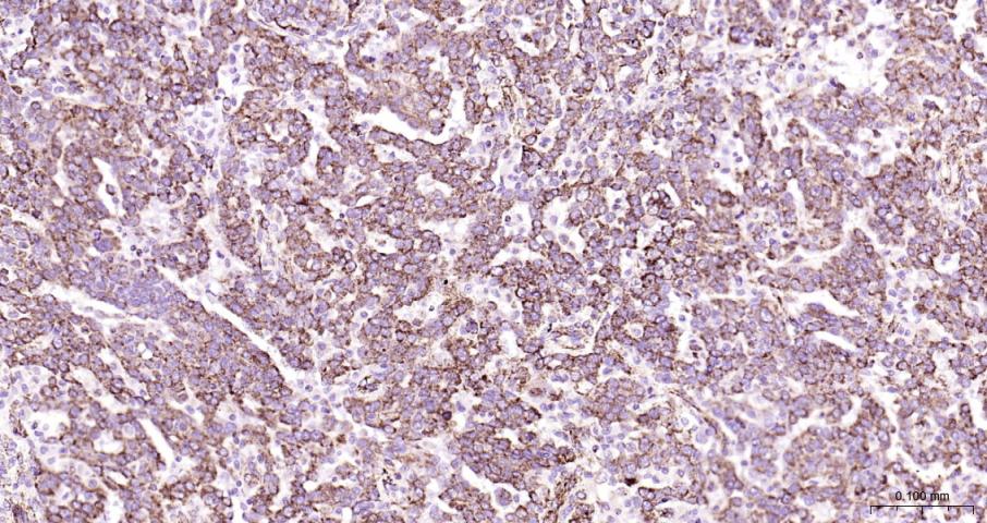 Paraformaldehyde-fixed, paraffin embedded Human Ovarian Cancer; Antigen retrieval by boiling in sodium citrate buffer (pH6.0) for 15 min; The section was incubated with Osteocalcin Polyclonal Antibody, Unconjugated (bs-4917R) at 1:200 overnight at 4°C, followed by conjugation to the bs-0295G-HRP and DAB (C-0010) staining.
