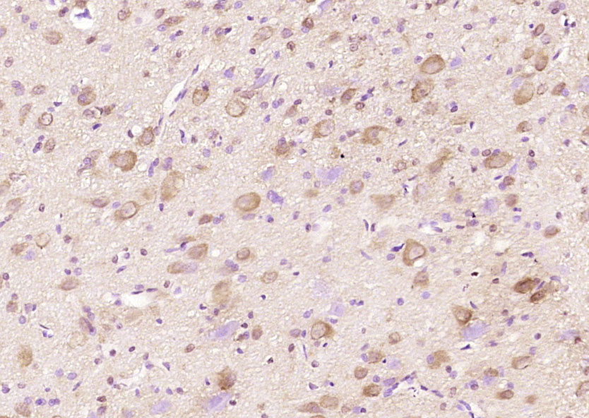 Paraformaldehyde-fixed, paraffin embedded (rat brain); Antigen retrieval by boiling in sodium citrate buffer (pH6.0) for 15min; Block endogenous peroxidase by 3% hydrogen peroxide for 20 minutes; Blocking buffer (normal goat serum) at 37°C for 30min; Antibody incubation with (gamma crystallin S) Polyclonal Antibody, Unconjugated (bs-9585R) at 1:200 overnight at 4°C, followed by operating according to SP Kit(Rabbit) (sp-0023) instructionsand DAB staining.