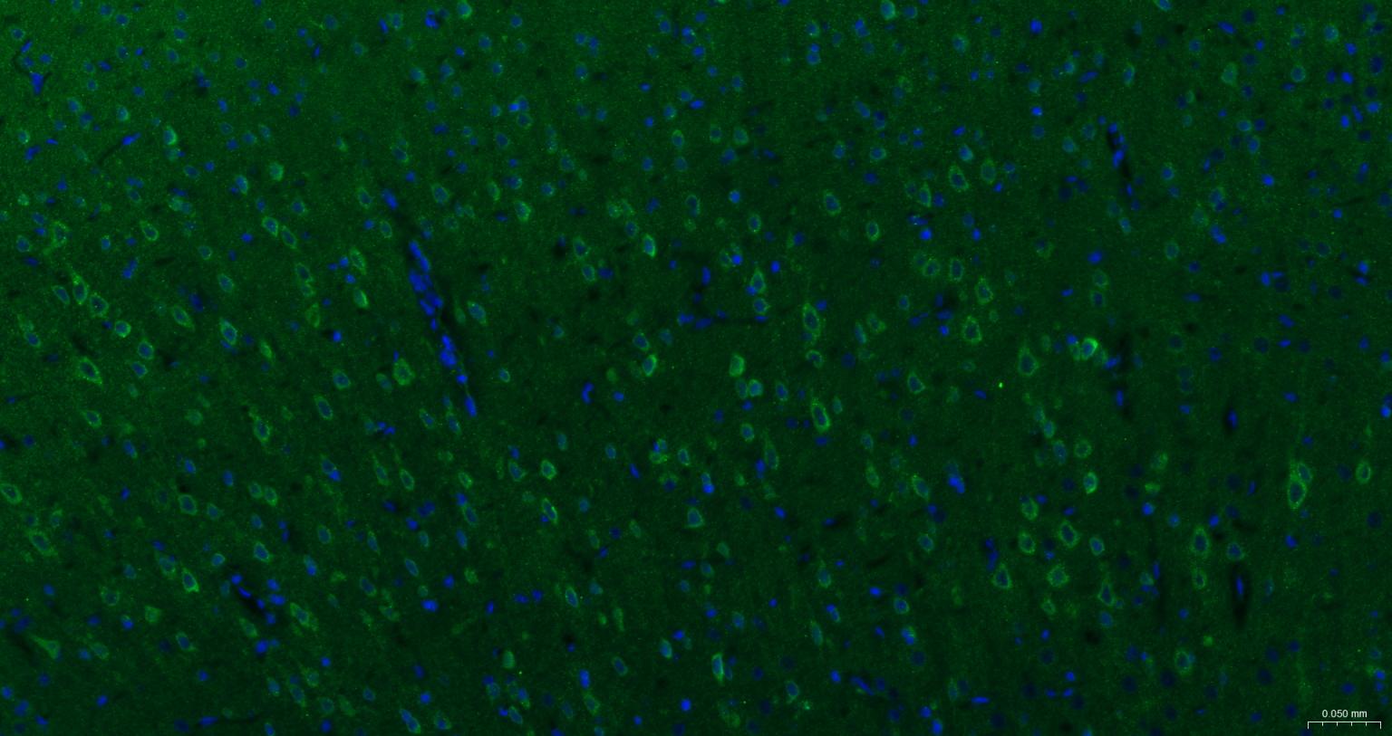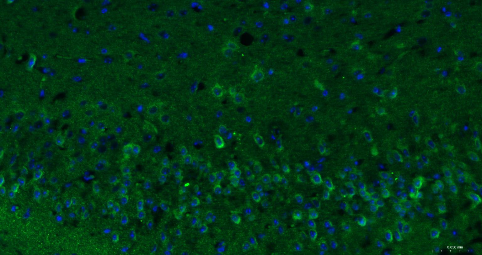Paraformaldehyde-fixed, paraffin embedded Rat Cerebrum; Antigen retrieval by boiling in sodium citrate buffer (pH6.0) for 15 min; The section was incubated with RAB10 Polyclonal Antibody, Unconjugated (bs-11257R) at 1:200 overnight at 4°C. Followed by conjugated Goat Anti-Rabbit IgG antibody (Green, bs-0295G-BF488), DAPI (blue, C02-04002) was used to stain the cell nuclei.