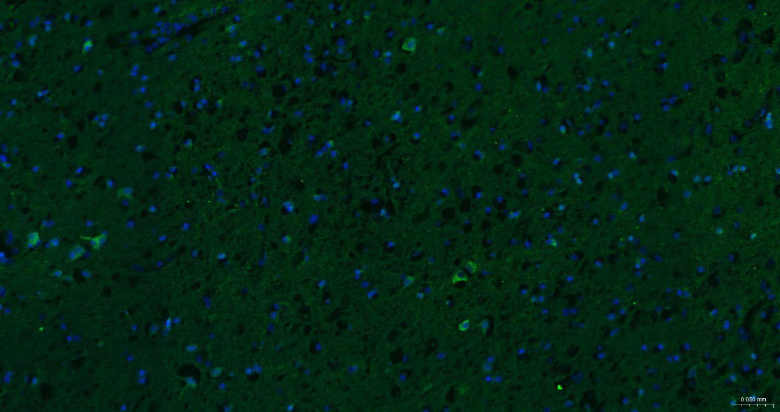 Paraformaldehyde-fixed, paraffin embedded Human Cerebrum; Antigen retrieval by boiling in sodium citrate buffer (pH6.0) for 15 min; The section was incubated with RAB10 Polyclonal Antibody, Unconjugated (bs-11257R) at 1:200 overnight at 4°C. Followed by conjugated Goat Anti-Rabbit IgG antibody (Green, bs-0295G-BF488), DAPI (blue, C02-04002) was used to stain the cell nuclei.