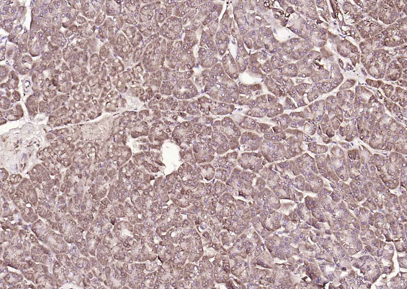 Paraformaldehyde-fixed, paraffin embedded (human pancreas); Antigen retrieval by boiling in sodium citrate buffer (pH6.0) for 15min; Block endogenous peroxidase by 3% hydrogen peroxide for 20 minutes; Blocking buffer (normal goat serum) at 37°C for 30min; Incubation with (Monoamine Oxidase B) Polyclonal Antibody, Unconjugated (bs-11297R) at 1:200 overnight at 4°C, followed by operating according to SP Kit(Rabbit) (sp-0023) instructionsand DAB staining.
