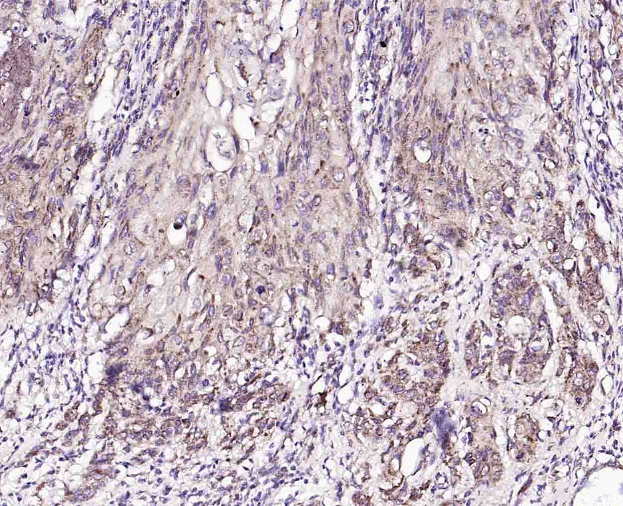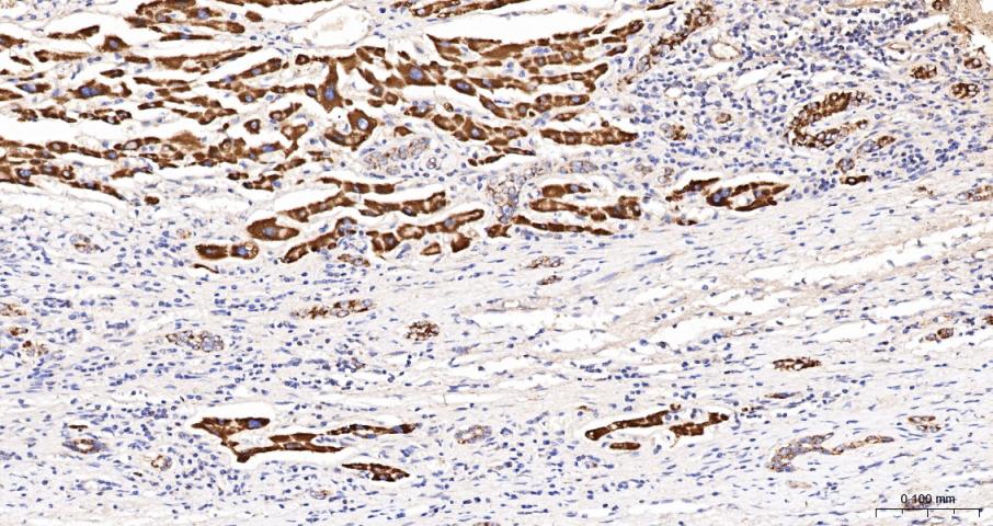 Paraformaldehyde-fixed, paraffin embedded (human kidney carcinoma); Antigen retrieval by boiling in sodium citrate buffer (pH6.0) for 15min; Block endogenous peroxidase by 3% hydrogen peroxide for 20 minutes; Blocking buffer (normal goat serum) at 37°C for 30min; Incubation with (amine Oxidase B Rabbit pAb) Polyclonal Antibody, Unconjugated (bs-11297R) at 1:200 overnight at 4°C, followed by operating according to SP Kit(Rabbit) (sp-0023) instructionsand DAB staining.