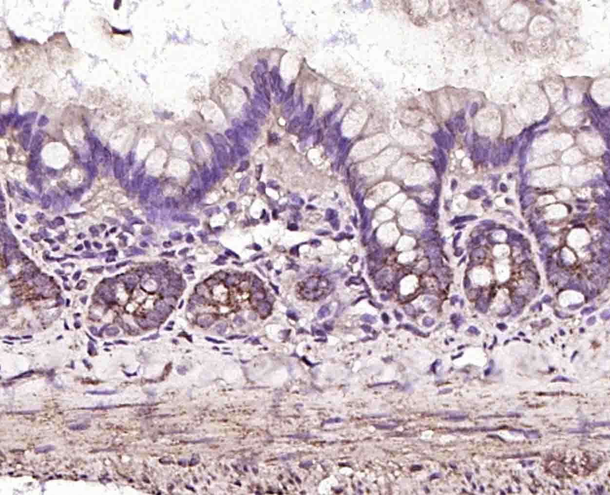 Paraformaldehyde-fixed, paraffin embedded (Human colon); Antigen retrieval by boiling in sodium citrate buffer (pH6.0) for 15min; Block endogenous peroxidase by 3% hydrogen peroxide for 20 minutes; Blocking buffer (normal goat serum) at 37°C for 30min; Incubation with (amine Oxidase B Rabbit pAb) Polyclonal Antibody, Unconjugated (bs-11297R) at 1:200 overnight at 4°C, followed by operating according to SP Kit(Rabbit) (sp-0023) instructionsand DAB staining.