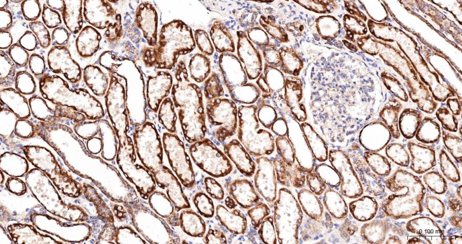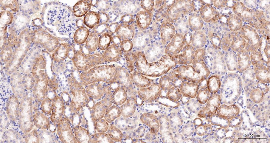 Paraformaldehyde-fixed, paraffin embedded Rat Kidney; Antigen retrieval by boiling in sodium citrate buffer (pH6.0) for 15 min; The section was incubated with Monoamine Oxidase B Polyclonal Antibody, Unconjugated (bs-11297R) at 1:200 overnight at 4°C, followed by conjugation to the bs-0295G-HRP and DAB (C-0010) staining.