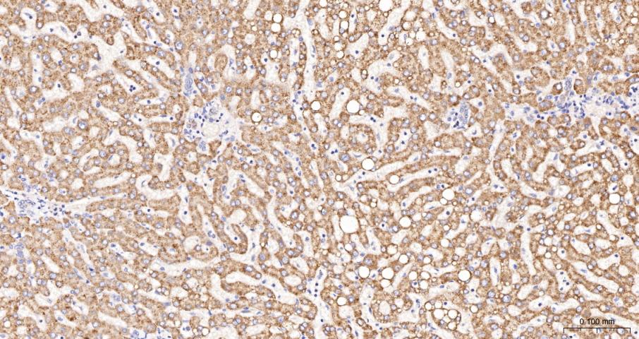 Paraformaldehyde-fixed, paraffin embedded Human Liver; Antigen retrieval by boiling in sodium citrate buffer (pH6.0) for 15 min; The section was incubated with Monoamine Oxidase B Polyclonal Antibody, Unconjugated (bs-11297R) at 1:200 overnight at 4°C, followed by conjugation to the bs-0295G-HRP and DAB (C-0010) staining.