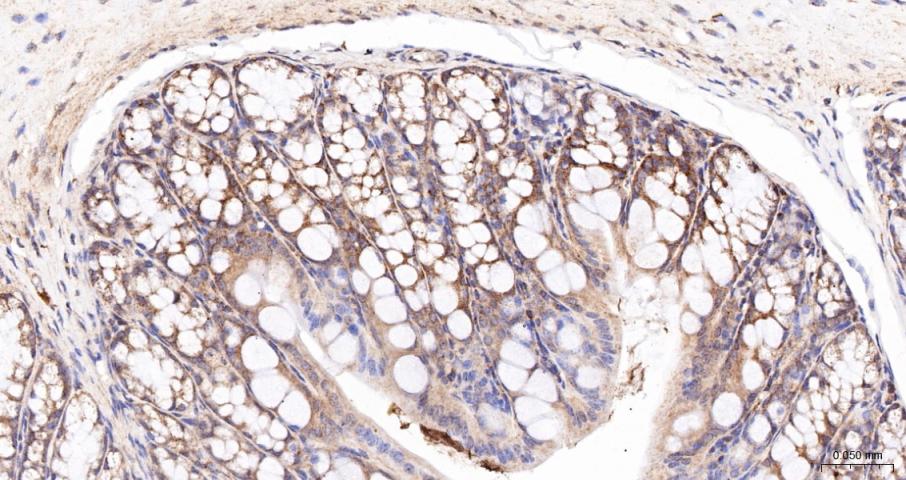 Paraformaldehyde-fixed, paraffin embedded Mouse Colon; Antigen retrieval by boiling in sodium citrate buffer (pH6.0) for 15 min; The section was incubated with Monoamine Oxidase B Polyclonal Antibody, Unconjugated (bs-11297R) at 1:200 overnight at 4°C, followed by conjugation to the bs-0295G-HRP and DAB (C-0010) staining.
