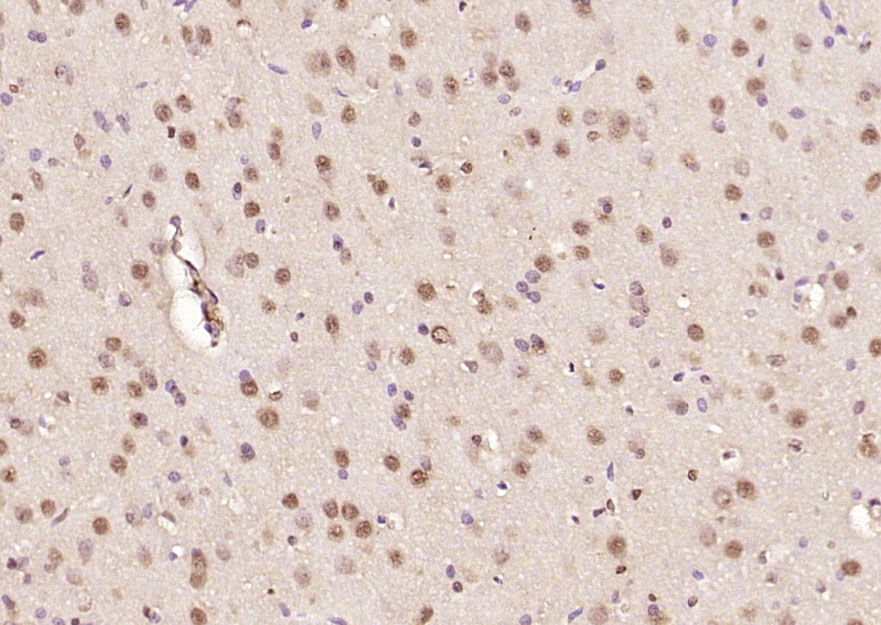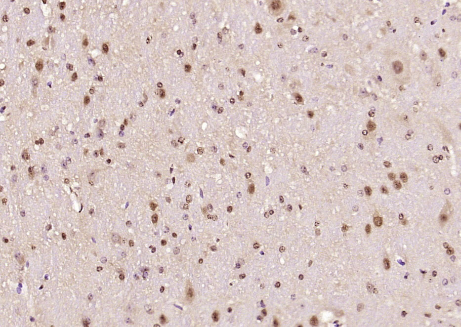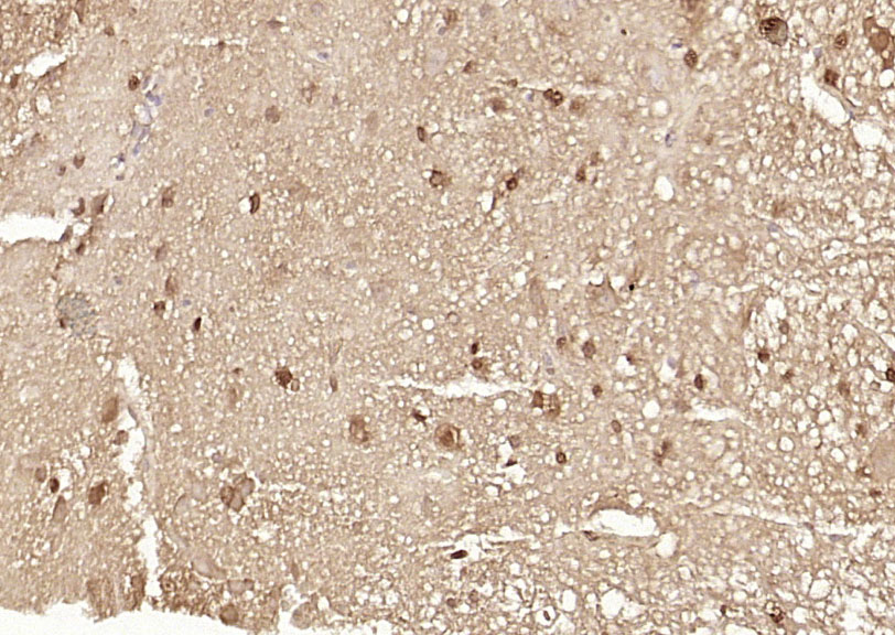 Paraformaldehyde-fixed, paraffin embedded (rat brain); Antigen retrieval by boiling in sodium citrate buffer (pH6.0) for 15min; Block endogenous peroxidase by 3% hydrogen peroxide for 20 minutes; Blocking buffer (normal goat serum) at 37°C for 30min; Antibody incubation with (Ataxin 7) Polyclonal Antibody, Unconjugated (bs-11318R) at 1:200 overnight at 4°C, followed by operating according to SP Kit(Rabbit) (sp-0023) instructionsand DAB staining.