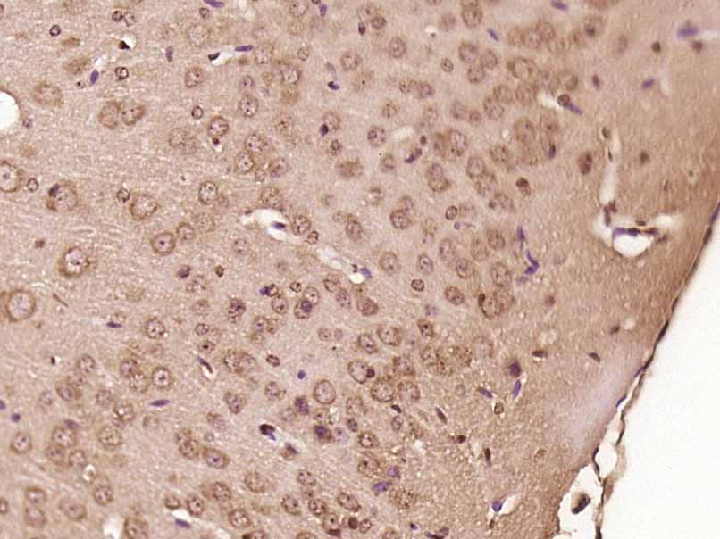 Paraformaldehyde-fixed, paraffin embedded (Mouse brain); Antigen retrieval by boiling in sodium citrate buffer (pH6.0) for 15min; Block endogenous peroxidase by 3% hydrogen peroxide for 20 minutes; Blocking buffer (normal goat serum) at 37°C for 30min; Antibody incubation with (SPAG16) Polyclonal Antibody, Unconjugated (bs-11485R) at 1:400 overnight at 4°C, followed by operating according to SP Kit(Rabbit) (sp-0023) instructionsand DAB staining.