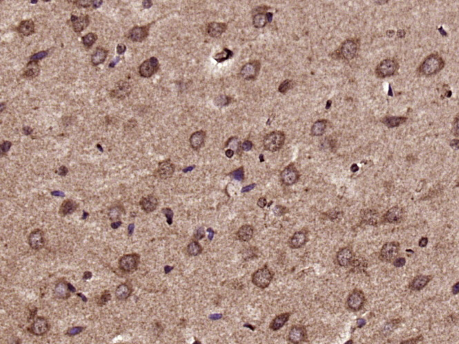 Paraformaldehyde-fixed, paraffin embedded (Rat brain); Antigen retrieval by boiling in sodium citrate buffer (pH6.0) for 15min; Block endogenous peroxidase by 3% hydrogen peroxide for 20 minutes; Blocking buffer (normal goat serum) at 37°C for 30min; Antibody incubation with (C1orf163) Polyclonal Antibody, Unconjugated (bs-15033R) at 1:400 overnight at 4°C, followed by operating according to SP Kit(Rabbit) (sp-0023) instructionsand DAB staining.