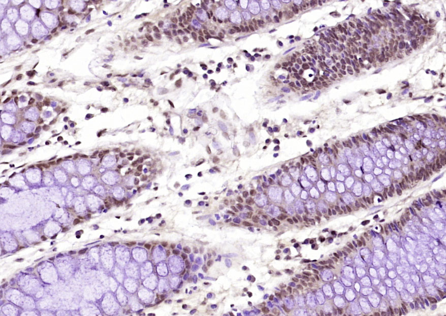Paraformaldehyde-fixed, paraffin embedded (human colon carcinoma); Antigen retrieval by boiling in sodium citrate buffer (pH6.0) for 15min; Block endogenous peroxidase by 3% hydrogen peroxide for 20 minutes; Blocking buffer (normal goat serum) at 37°C for 30min; Antibody incubation with (EBP1) Polyclonal Antibody, Unconjugated (bs-13047R) at 1:200 overnight at 4°C, followed by operating according to SP Kit(Rabbit) (sp-0023) instructionsand DAB staining.