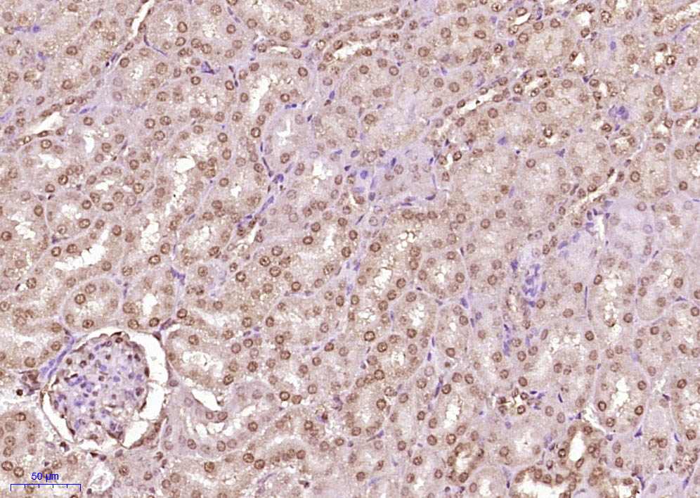 Paraformaldehyde-fixed, paraffin embedded (Mouse kidney); Antigen retrieval by boiling in sodium citrate buffer (pH6.0) for 15min; Block endogenous peroxidase by 3% hydrogen peroxide for 20 minutes; Blocking buffer (normal goat serum) at 37°C for 30min; Antibody incubation with (MYST1/KAT8) Polyclonal Antibody, Unconjugated (bs-4312R) at 1:400 overnight at 4°C, followed by operating according to SP Kit(Rabbit) (sp-0023) instructionsand DAB staining.