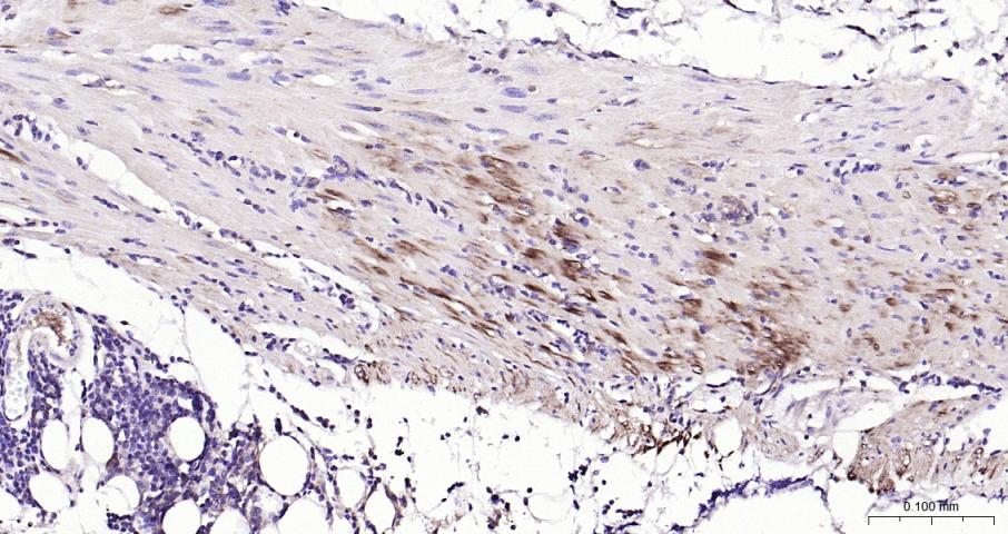Paraformaldehyde-fixed, paraffin embedded (human colon carcinoma); Antigen retrieval by boiling in sodium citrate buffer (pH6.0) for 15min; Block endogenous peroxidase by 3% hydrogen peroxide for 20 minutes; Blocking buffer (normal goat serum) at 37°C for 30min; Antibody incubation with (alpha smooth muscle Actin) Polyclonal Antibody, Unconjugated (bs-10196R) at 1:200 overnight at 4°C, followed by operating according to SP Kit(Rabbit) (sp-0023) instructionsand