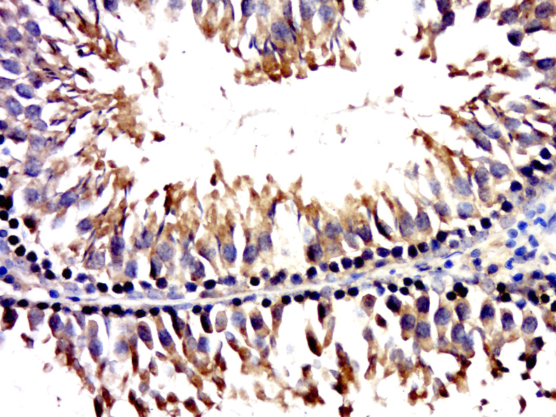 Paraformaldehyde-fixed, paraffin embedded (rat testis); Antigen retrieval by boiling in sodium citrate buffer (pH6.0) for 15min; Block endogenous peroxidase by 3% hydrogen peroxide for 20 minutes; Blocking buffer (normal goat serum) at 37°C for 30min; Antibody incubation with (CCDC73) Polyclonal Antibody, Unconjugated (bs-13812R) at 1:5000 overnight at 4°C, followed by a conjugated secondary (sp-0023) for 20 minutes and DAB staining.