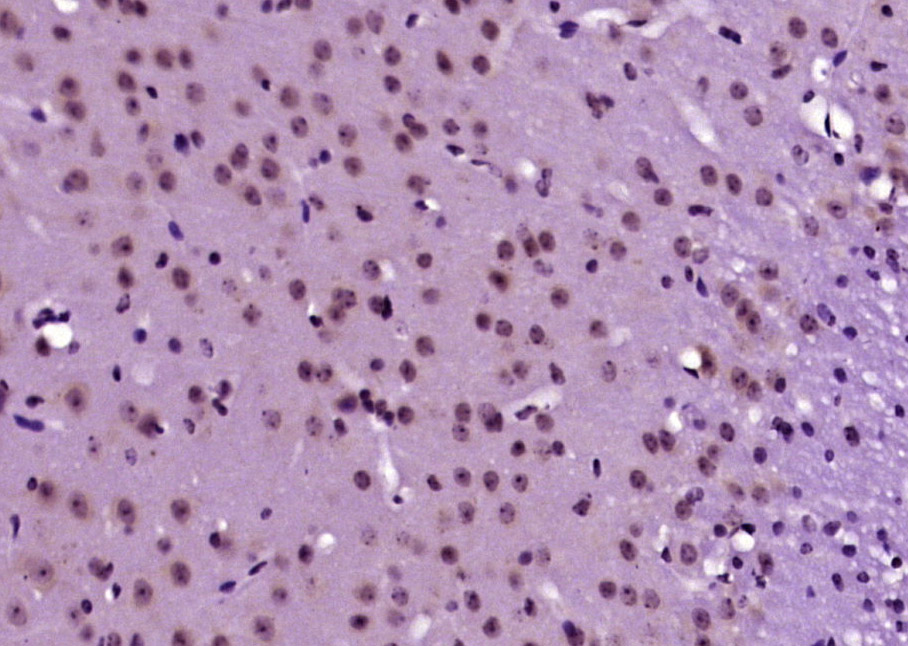 Paraformaldehyde-fixed, paraffin embedded (mouse brain tissue); Antigen retrieval by boiling in sodium citrate buffer (pH6.0) for 15min; Block endogenous peroxidase by 3% hydrogen peroxide for 20 minutes; Blocking buffer (normal goat serum) at 37°C for 30min; Antibody incubation with (JNK1+JNK2) Polyclonal Antibody, Unconjugated (bs-10562R) at 1:400 overnight at 4°C, followed by operating according to SP Kit(Rabbit) (sp-0023) instructionsand DAB staining.