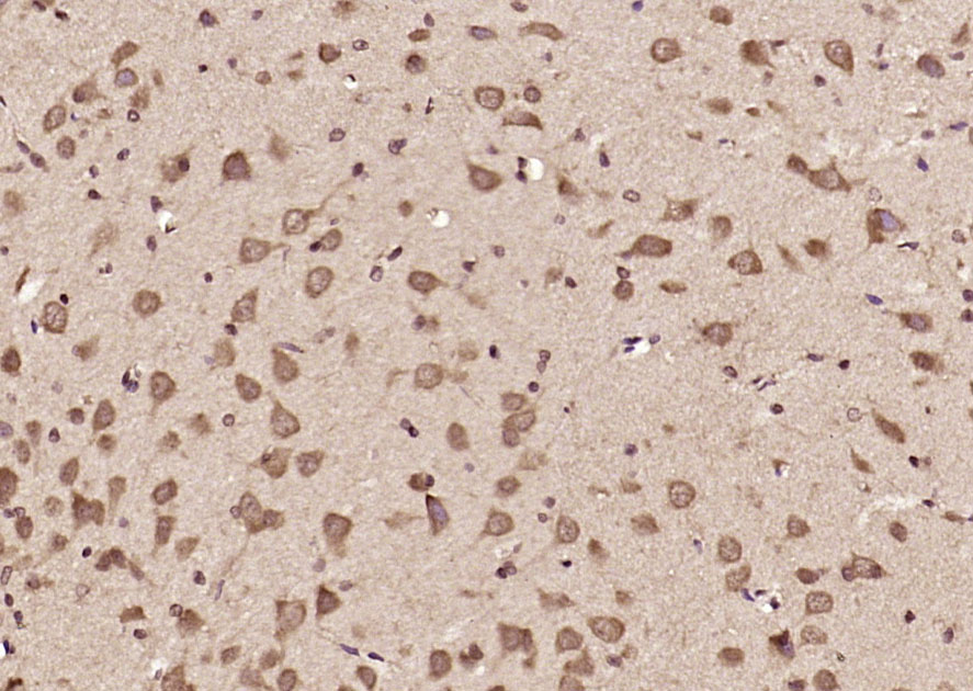 Paraformaldehyde-fixed, paraffin embedded (mouse brain); Antigen retrieval by boiling in sodium citrate buffer (pH6.0) for 15min; Block endogenous peroxidase by 3% hydrogen peroxide for 20 minutes; Blocking buffer (normal goat serum) at 37°C for 30min; Antibody incubation with (DENND5A) Polyclonal Antibody, Unconjugated (bs-14274R) at 1:200 overnight at 4°C, followed by operating according to SP Kit(Rabbit) (sp-0023) instructionsand DAB staining.