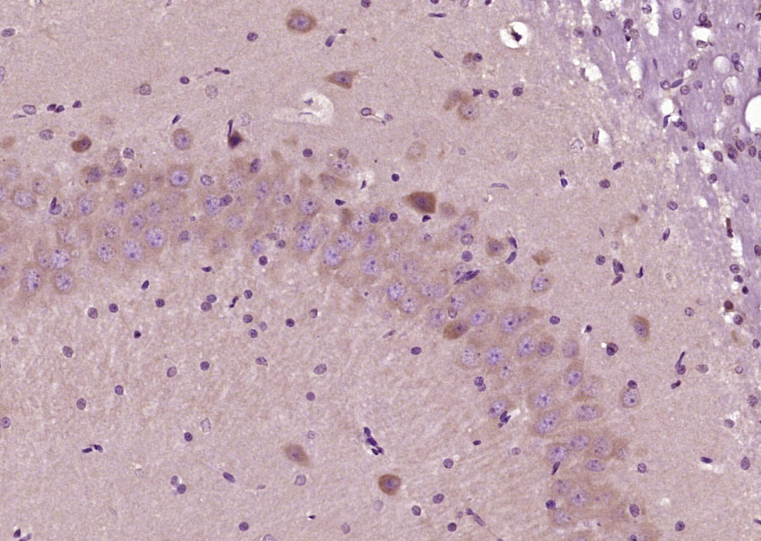 Paraformaldehyde-fixed, paraffin embedded (Rat brain); Antigen retrieval by boiling in sodium citrate buffer (pH6.0) for 15min; Block endogenous peroxidase by 3% hydrogen peroxide for 20 minutes; Blocking buffer (normal goat serum) at 37°C for 30min; Antibody incubation with (FUT10) Polyclonal Antibody, Unconjugated (bs-16197R) at 1:400 overnight at 4°C, followed by operating according to SP Kit(Rabbit) (sp-0023) instructionsand DAB staining.