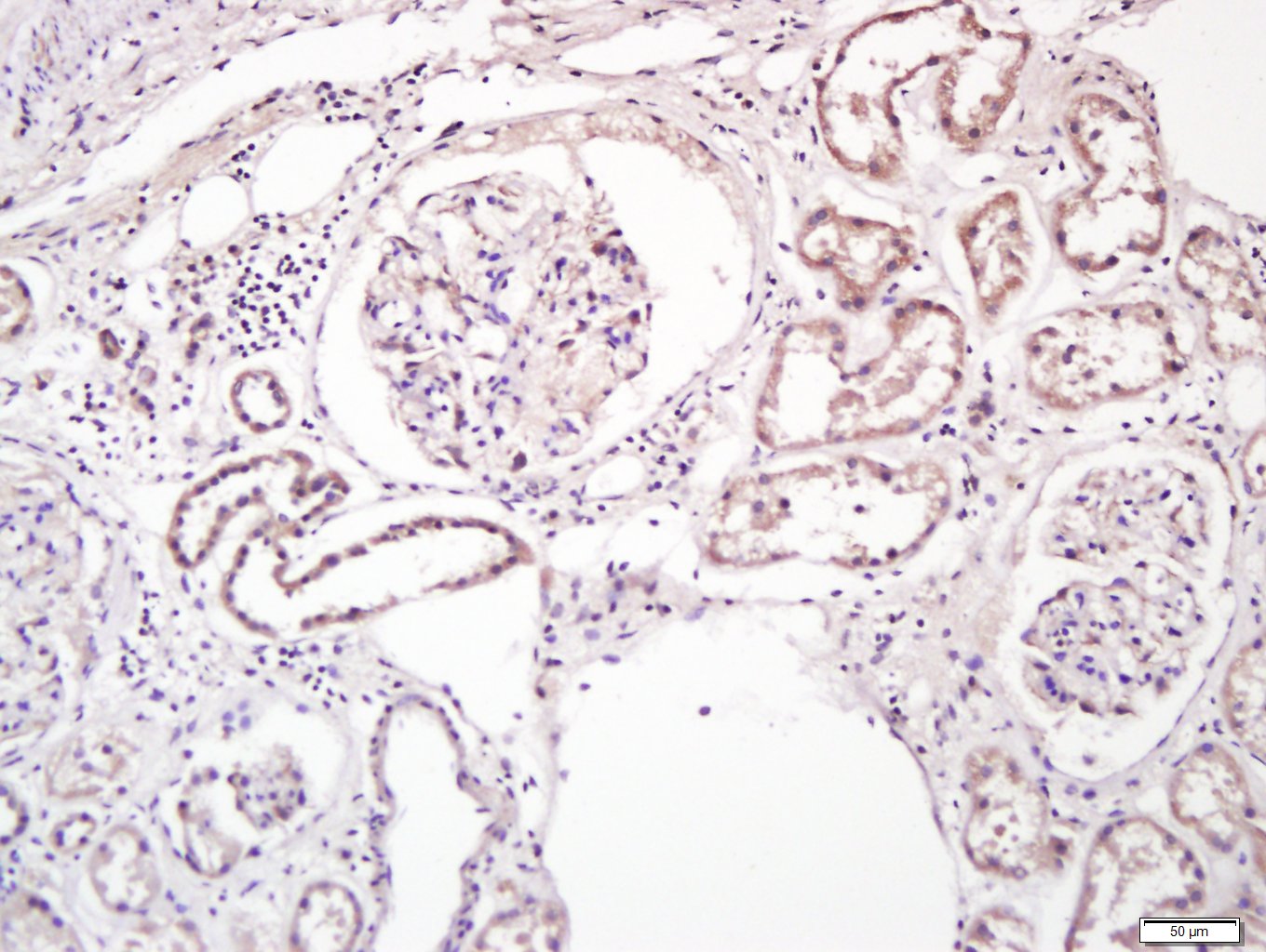 Paraformaldehyde-fixed, paraffin embedded (human kidney); Antigen retrieval by boiling in sodium citrate buffer (pH6.0) for 15min; Block endogenous peroxidase by 3% hydrogen peroxide for 20 minutes; Blocking buffer (normal goat serum) at 37°C for 30min; Antibody incubation with (TNFAIP8L3) Polyclonal Antibody, Unconjugated (bs-16609R) at 1:400 overnight at 4°C, followed by a conjugated secondary (sp-0023) for 20 minutes and DAB staining.