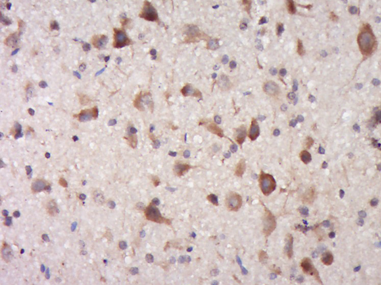 Paraformaldehyde-fixed, paraffin embedded (Rat brain); Antigen retrieval by boiling in sodium citrate buffer (pH6.0) for 15min; Block endogenous peroxidase by 3% hydrogen peroxide for 20 minutes; Blocking buffer (normal goat serum) at 37°C for 30min; Antibody incubation with (TRIM68) Polyclonal Antibody, Unconjugated (bs-17123R) at 1:400 overnight at 4°C, followed by operating according to SP Kit(Rabbit) (sp-0023) instructionsand DAB staining.