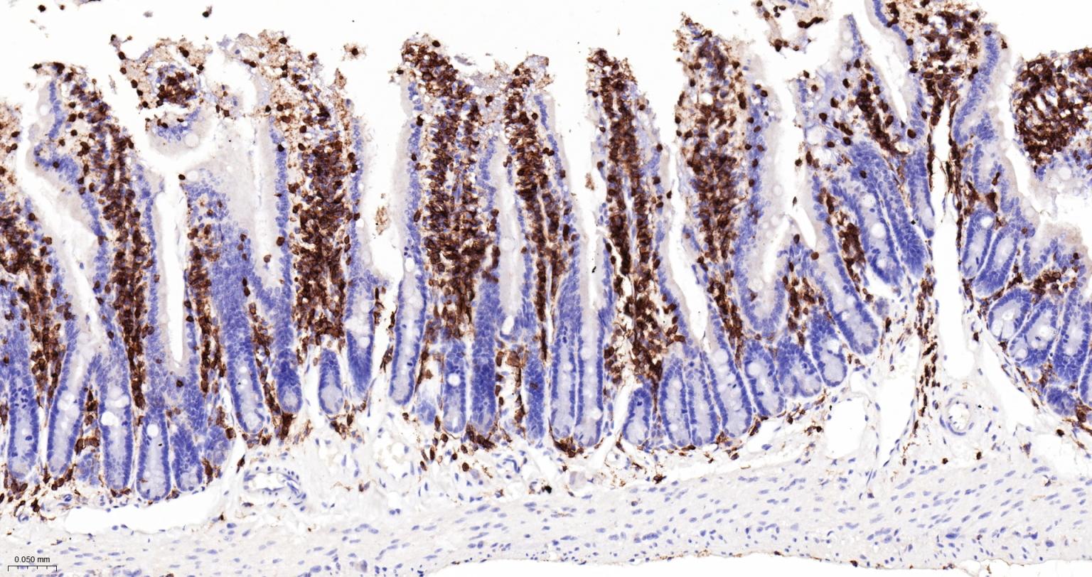 Paraformaldehyde-fixed, paraffin embedded Mouse Small Intestine; Antigen retrieval by boiling in sodium citrate buffer (pH6.0) for 15 min; Antibody incubation with CD45 Polyclonal Antibody, Unconjugated(bs-10602R) at 1:200 overnight at 4°C, followed by conjugation to the bs-0295G-HRP and DAB (C-0010) staining.