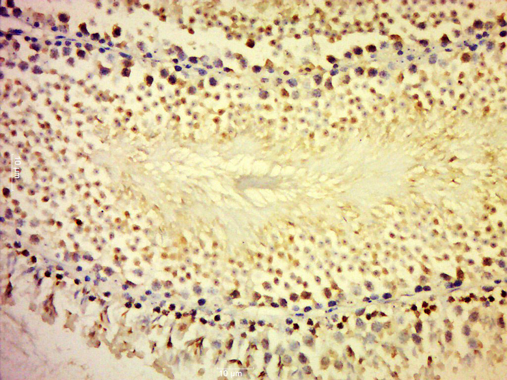 Paraformaldehyde-fixed, paraffin embedded (Rat testis); Antigen retrieval by boiling in sodium citrate buffer (pH6.0) for 15min; Block endogenous peroxidase by 3% hydrogen peroxide for 20 minutes; Blocking buffer (normal goat serum) at 37°C for 30min; Antibody incubation with (MORN1) Polyclonal Antibody, Unconjugated (bs-17720R) at 1:500 overnight at 4°C, followed by a conjugated secondary (sp-0023) for 20 minutes and DAB staining.