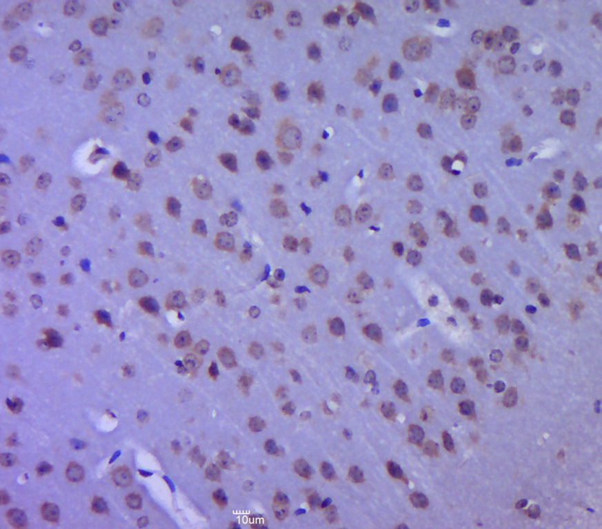 Paraformaldehyde-fixed, paraffin embedded (mouse brain tissue); Antigen retrieval by boiling in sodium citrate buffer (pH6.0) for 15min; Block endogenous peroxidase by 3% hydrogen peroxide for 20 minutes; Blocking buffer (normal goat serum) at 37°C for 30min; Antibody incubation with (MTHFSD) Polyclonal Antibody, Unconjugated (bs-17880R) at 1:400 overnight at 4°C, followed by a conjugated secondary (sp-0023) for 20 minutes and DAB staining.