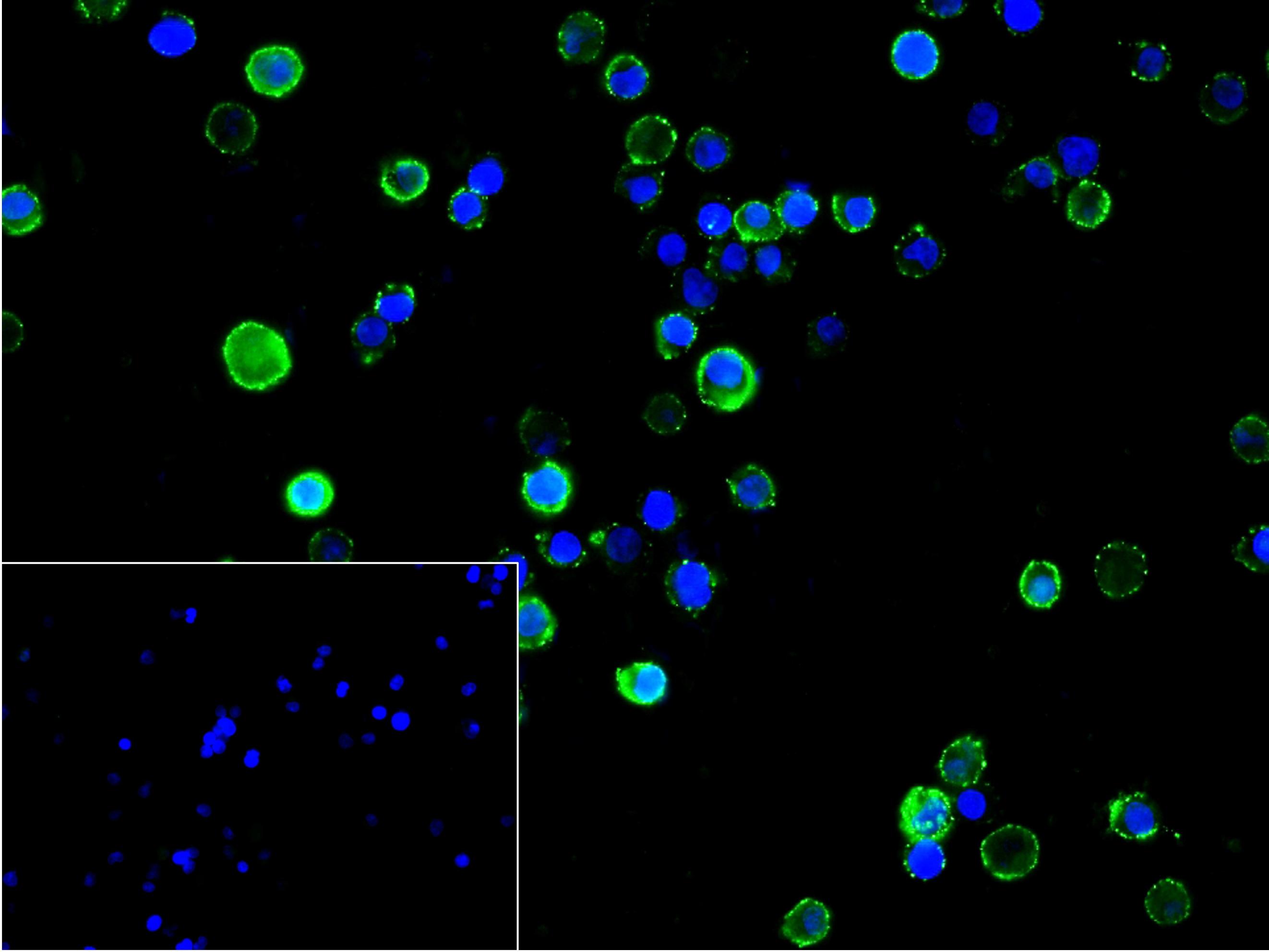 4% Paraformaldehyde-fixed Daudi (H) cell; Antibody incubation with (HAVCR2/TIM-3) polyclonal Antibody, unconjugated (bs-8766R) 1:100, 90 min at 37°C; followed by conjugated Goat Anti-Rabbit IgG antibody (green, bs-60295G-BF488) at 37°C for 90 min, DAPI (blue, C02-04002) was used to stain the cell nuclei. PBS instead of the primary antibody was used as the blank control.