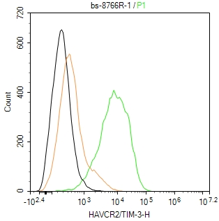 The Daudi (H) cells were incubated in 5%BSA to block non-specific protein-protein interactions (30 min at r.t.) , followed by secondary antibody incubation for 40 min at room temperature. Primary Antibody (green): Rabbit Anti-HAVCR2/TIM-3 antibody (bs-8766R): 1 μg/10^6 cells; Isotype Control (orange): Rabbit IgG (bs-0295P). Blank control (black): PBS. Acquisition of 20,000 events was performed.