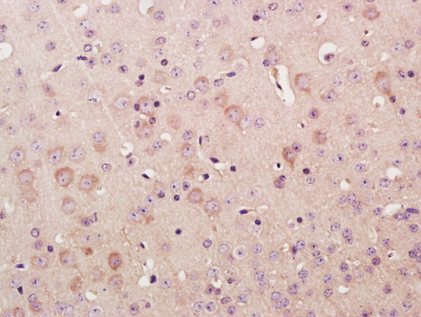 Paraformaldehyde-fixed, paraffin embedded (Mouse brain); Antigen retrieval by boiling in sodium citrate buffer (pH6.0) for 15min; Block endogenous peroxidase by 3% hydrogen peroxide for 20 minutes; Blocking buffer (normal goat serum) at 37°C for 30min; Antibody incubation with (Leucyl tRNA synthetase) Polyclonal Antibody, Unconjugated (bs-18227R) at 1:400 overnight at 4°C, followed by a conjugated secondary antibody (sp-0023) for 20 minutes and DAB staining.