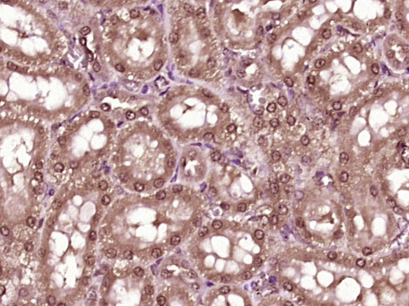 Paraformaldehyde-fixed, paraffin embedded (Rat kidney); Antigen retrieval by boiling in sodium citrate buffer (pH6.0) for 15min; Block endogenous peroxidase by 3% hydrogen peroxide for 20 minutes; Blocking buffer (normal goat serum) at 37°C for 30min; Antibody incubation with (ZFAND2B) Polyclonal Antibody, Unconjugated (bs-18519R) at 1:400 overnight at 4°C, followed by operating according to SP Kit(Rabbit) (sp-0023) instructionsand DAB staining.