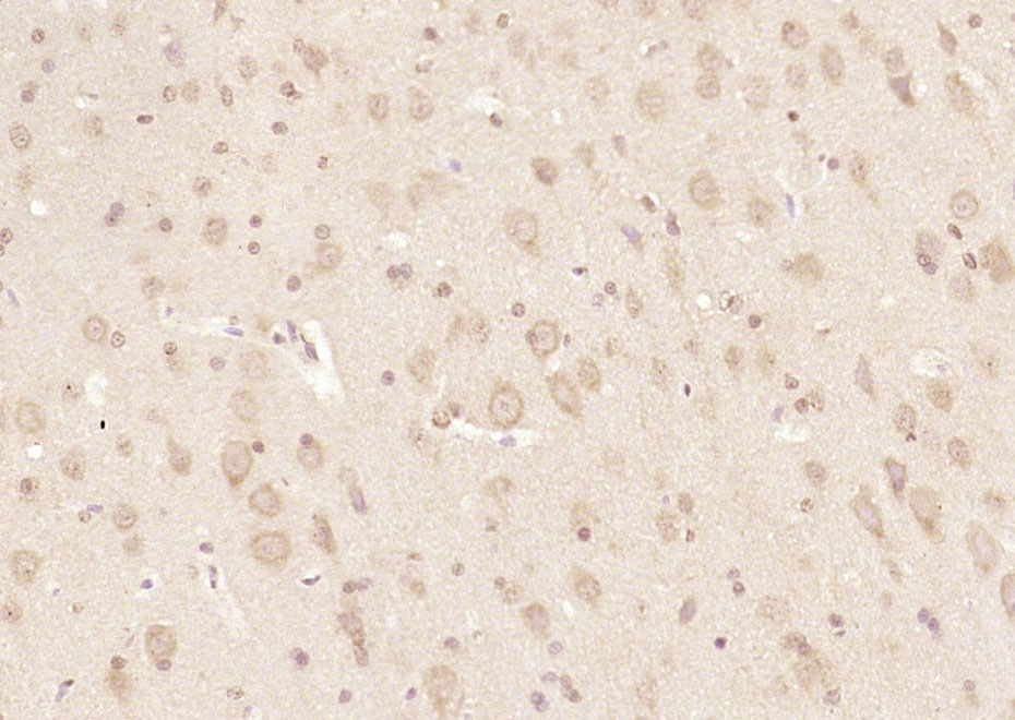 Paraformaldehyde-fixed, paraffin embedded (mouse brain); Antigen retrieval by boiling in sodium citrate buffer (pH6.0) for 15min; Block endogenous peroxidase by 3% hydrogen peroxide for 20 minutes; Blocking buffer (normal goat serum) at 37°C for 30min; Antibody incubation with (RRAGA + RRAGB) Polyclonal Antibody, Unconjugated (bs-10731R) at 1:200 overnight at 4°C, followed by operating according to SP Kit(Rabbit) (sp-0023) instructionsand DAB staining.