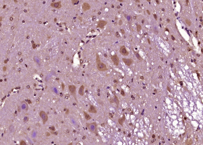 Paraformaldehyde-fixed, paraffin embedded (Mouse brain); Antigen retrieval by boiling in sodium citrate buffer (pH6.0) for 15min; Block endogenous peroxidase by 3% hydrogen peroxide for 20 minutes; Blocking buffer (normal goat serum) at 37°C for 30min; Antibody incubation with (ZFP759) Polyclonal Antibody, Unconjugated (bs-19131R) at 1:400 overnight at 4°C, followed by operating according to SP Kit(Rabbit) (sp-0023) instructionsand DAB staining.