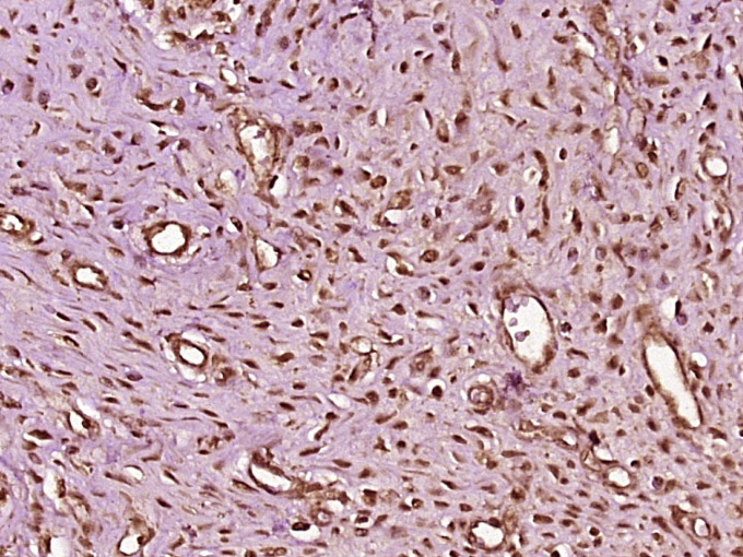 Paraformaldehyde-fixed, paraffin embedded (rat uterus tissue); Antigen retrieval by boiling in sodium citrate buffer (pH6.0) for 15min; Block endogenous peroxidase by 3% hydrogen peroxide for 20 minutes; Blocking buffer (normal goat serum) at 37°C for 30min; Antibody incubation with (NR1D1) Polyclonal Antibody, Unconjugated (bs-20222R) at 1:400 overnight at 4°C, followed by operating according to SP Kit(Rabbit) (sp-0023) instructionsand DAB staining.