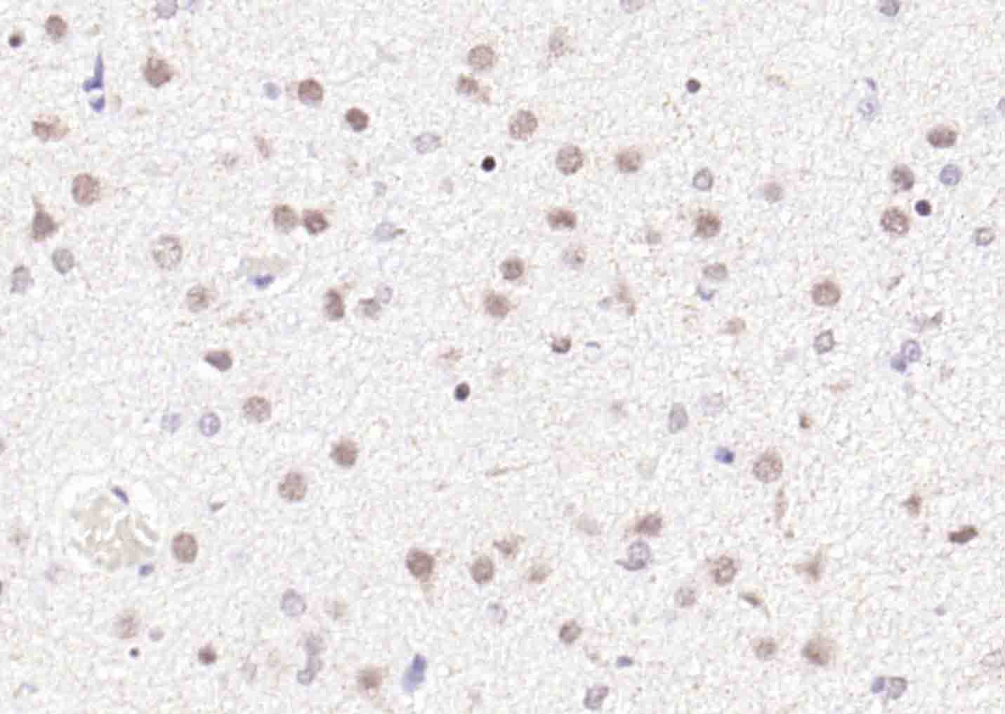 Paraformaldehyde-fixed, paraffin embedded (Rat hypothalamus); Antigen retrieval by boiling in sodium citrate buffer (pH6.0) for 15min; Block endogenous peroxidase by 3% hydrogen peroxide for 20 minutes; Blocking buffer (normal goat serum) at 37°C for 30min; Antibody incubation with (NR1D1) Polyclonal Antibody, Unconjugated (bs-20222R) at 1:200 overnight at 4°C, followed by operating according to SP Kit(Rabbit) (sp-0023) instructionsand DAB staining.