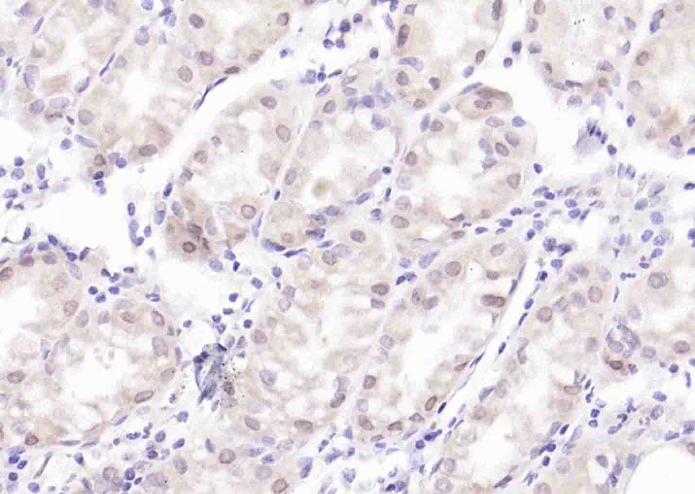 Paraformaldehyde-fixed, paraffin embedded (human stomach); Antigen retrieval by boiling in sodium citrate buffer (pH6.0) for 15min; Block endogenous peroxidase by 3% hydrogen peroxide for 20 minutes; Blocking buffer (normal goat serum) at 37°C for 30min; Antibody incubation with (NR1D1) Polyclonal Antibody, Unconjugated (bs-20222R) at 1:200 overnight at 4°C, followed by operating according to SP Kit(Rabbit) (sp-0023) instructionsand DAB staining.