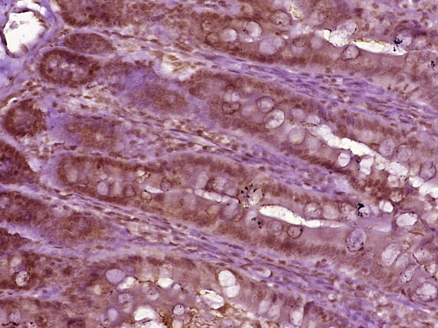 Paraformaldehyde-fixed, paraffin embedded (rat colon tissue); Antigen retrieval by boiling in sodium citrate buffer (pH6.0) for 15min; Block endogenous peroxidase by 3% hydrogen peroxide for 20 minutes; Blocking buffer (normal goat serum) at 37°C for 30min; Antibody incubation with (PRP18 homolog) Polyclonal Antibody, Unconjugated (bs-19402R) at 1:400 overnight at 4°C, followed by operating according to SP Kit(Rabbit) (sp-0023) instructionsand DAB staining.