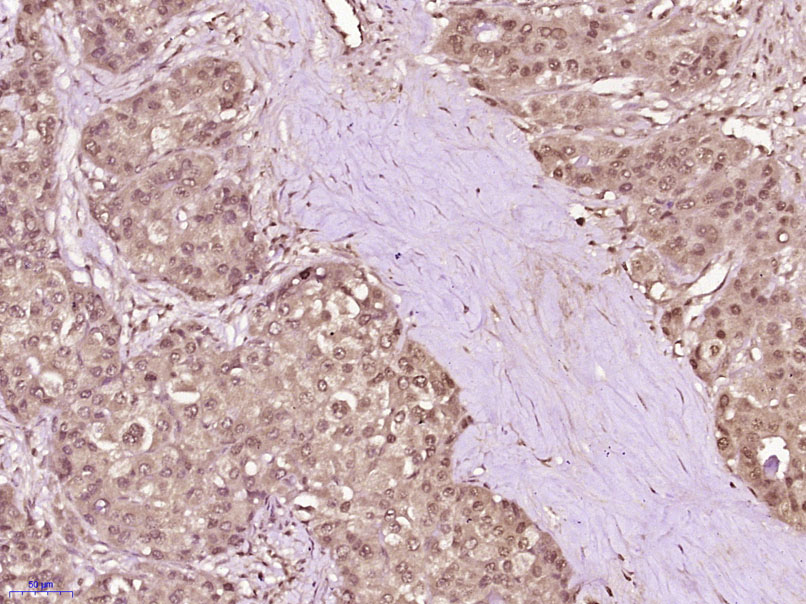 Paraformaldehyde-fixed, paraffin embedded (Human breast carcinoma); Antigen retrieval by boiling in sodium citrate buffer (pH6.0) for 15min; Block endogenous peroxidase by 3% hydrogen peroxide for 20 minutes; Blocking buffer (normal goat serum) at 37°C for 30min; Antibody incubation with (SNF2H) Polyclonal Antibody, Unconjugated (bs-12653R) at 1:400 overnight at 4°C, followed by operating according to SP Kit(Rabbit) (sp-0023) instructionsand DAB staining.