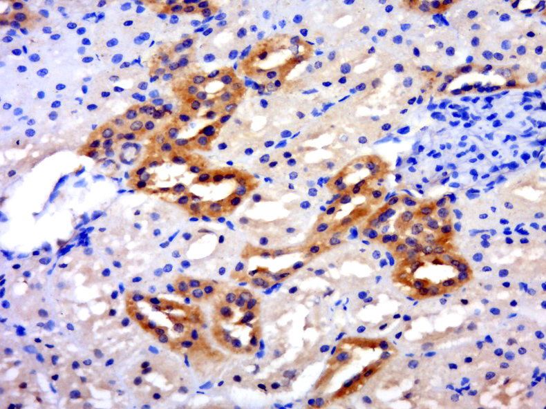 Paraformaldehyde-fixed, paraffin embedded (rat kidney); Antigen retrieval by boiling in sodium citrate buffer (pH6.0) for 15min; Block endogenous peroxidase by 3% hydrogen peroxide for 20 minutes; Blocking buffer (normal goat serum) at 37°C for 30min; Antibody incubation with (SLC26A6) Polyclonal Antibody, Unconjugated (bs-20817R) at 1:400 overnight at 4°C, followed by a conjugated secondary (sp-0023) for 20 minutes and DAB staining.