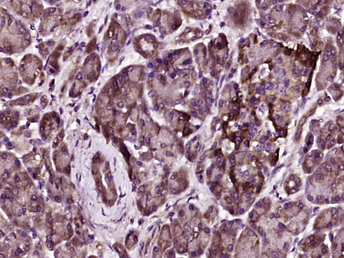 Paraformaldehyde-fixed, paraffin embedded (human Pancreatic cancer); Antigen retrieval by boiling in sodium citrate buffer (pH6.0) for 15min; Block endogenous peroxidase by 3% hydrogen peroxide for 20 minutes; Blocking buffer (normal goat serum) at 37°C for 30min; Antibody incubation with (SEMA3G) Polyclonal Antibody, Unconjugated (bs-4461R) at 1:400 overnight at 4°C, followed by operating according to SP Kit(Rabbit) (sp-0023) instructionsand DAB staining.