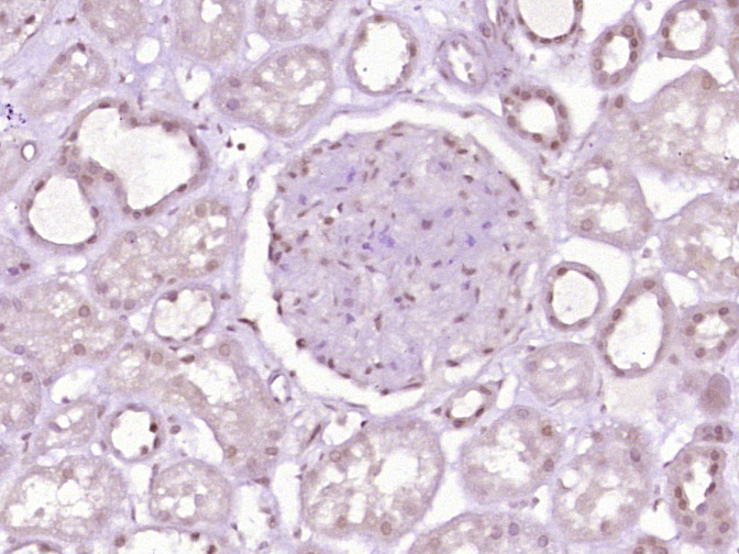 Paraformaldehyde-fixed, paraffin embedded (Human kidney tissue); Antigen retrieval by boiling in sodium citrate buffer (pH6.0) for 15min; Block endogenous peroxidase by 3% hydrogen peroxide for 20 minutes; Blocking buffer (normal goat serum) at 37°C for 30min; Antibody incubation with (SFRS17A) Polyclonal Antibody, Unconjugated (bs-21110R) at 1:400 overnight at 4°C, followed by operating according to SP Kit(Rabbit) (sp-0023) instructionsand DAB staining.